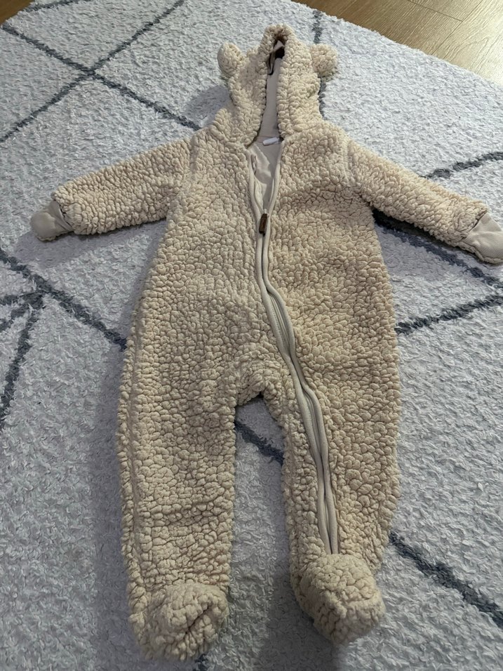 Gri renkte, yumuşak ve sıcak peluş kumaştan yapılmış bebek tulumu. Kapüşonunda kulak detayları ve kolay giyilmesi için ön fermuar bulunur. 6-9 ay