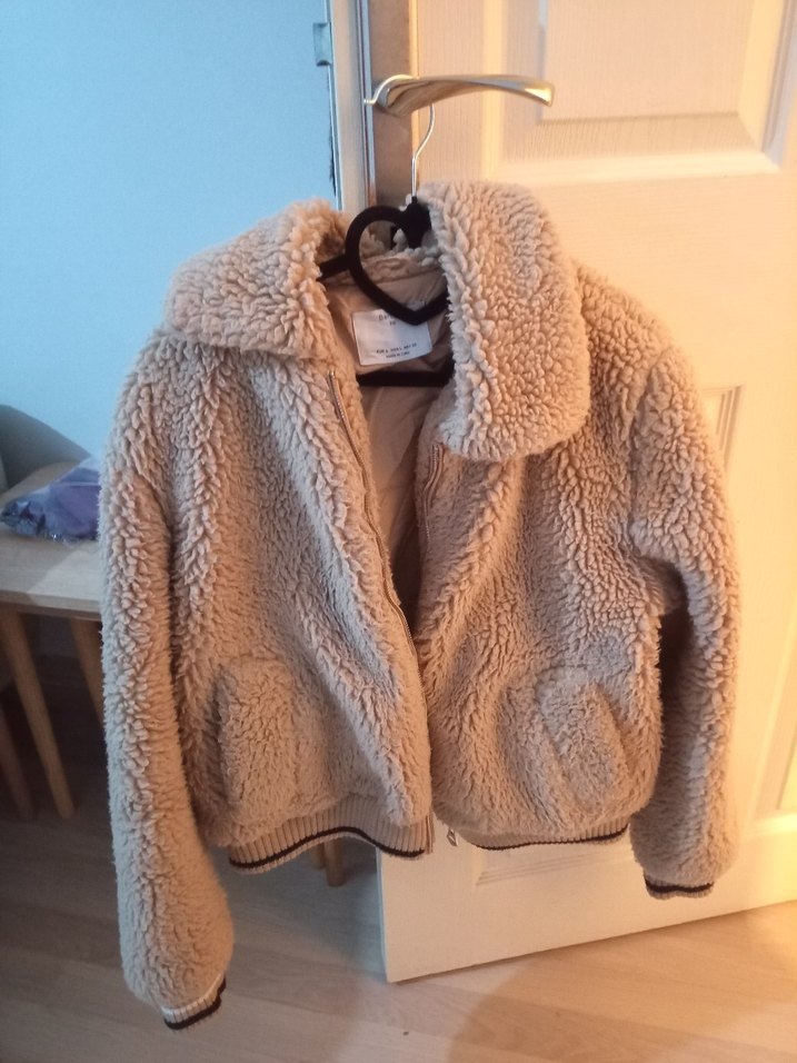 Bej renkli, peluş detaylı yumuşak kumaştan, yakalı, bol kesim, uzun kollu ve midi boy kadın ceket. Rahat sokak stili için uygundur. Ürünüm çok iyi durumdadır gönül rahatlığıyla kullanabilirsiniz.