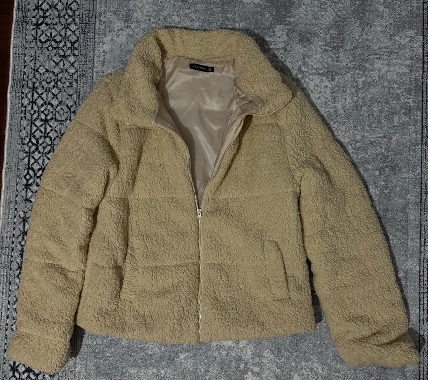 Bej renkli, peluş detaylı, uzun kollu ve normal kesimli ceket. Rahat ve sıcak tutan kumaştan, günlük kullanıma uygun.
