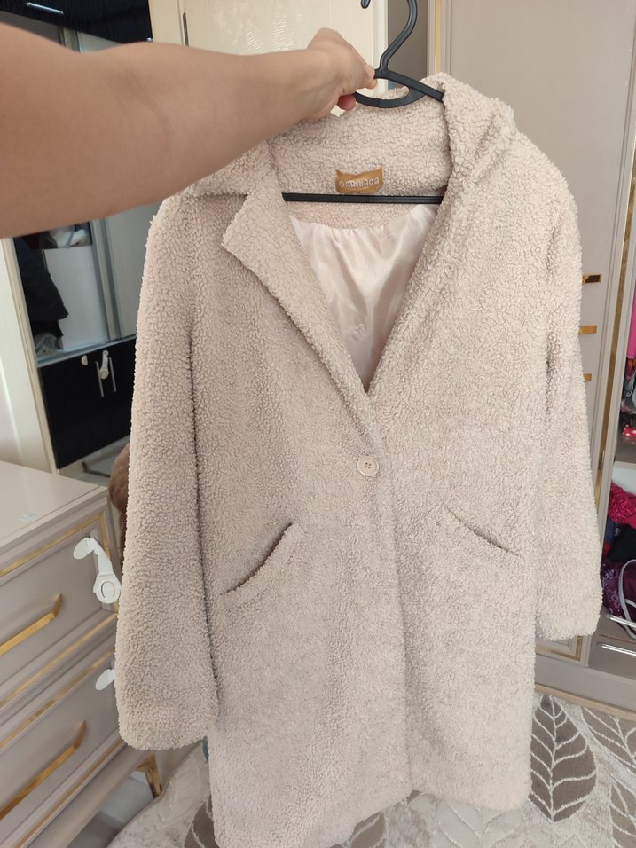 Bej renk, peluş detaylı kadın kaban, uzun kollu ve geniş kesimdir. Rahat ve sıcak tutan kumaştan yapılmıştır, günlük kullanıma uygundur.
