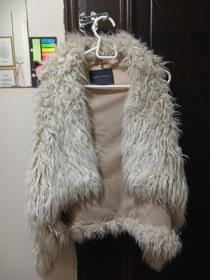Bej renkte, yün kumaştan yapılmış, peluş detaylı, straplez yakalı ve kolsuz midi yelek. Salaş kesimiyle sokak stili için uygun.