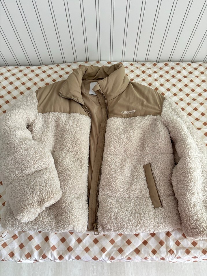 Bej renkli, peluş detaylı, uzun kollu, bol kesim kadın mont. Normal boyda, günlük kullanıma uygun yumuşak dokulu sıcak rahat bir model.