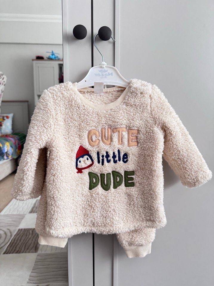 Bej renkli, peluş kumaştan yapılmış erkek çocuk sweatshirtü. Uzun kollu, bol kesim ve yuvarlak yakalıdır. "CUTE little DUDE" yazılı baskı ve kürk detayları bulunur. İkili takım