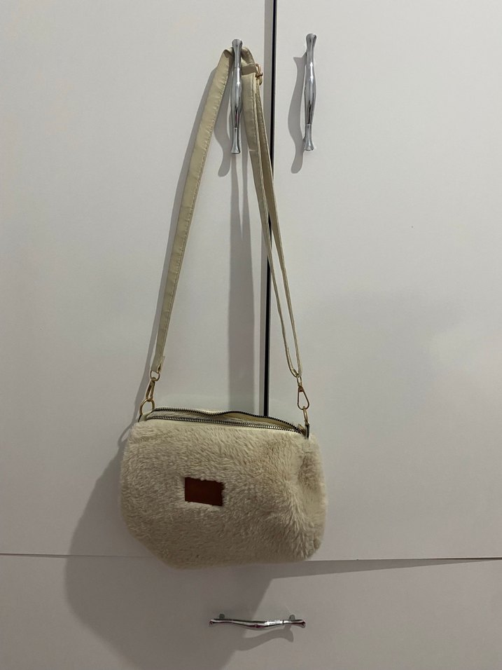 Ayarlanabilir askılı, peluş detaylı bej kadın çantası, rahat sokak stili için uygundur.