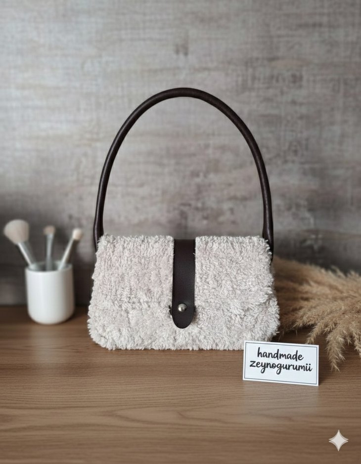 Yumuşak peluş kumaşlı, bej tonlu beyaz kadın çantasıdır. Kürk detaylı, baskılı ve çağdaş stilde olup, sağlam saplıdır. El yapımıdır, rahat ve bohem tarz için uygundur. Astarlıdır.