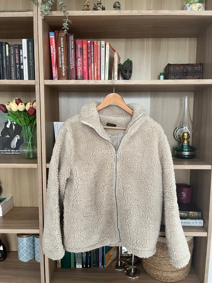 Yumuşak ve sıcak kumaştan, uzun kollu, yüksek yakalı bej kadın mont.günlük kullanıma uygun. Önünde ufak bir iki keke var fotoğrafta gözüküyor başka sorun yok