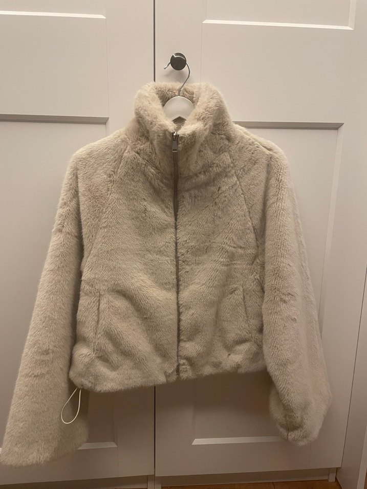Bej renkli, peluş detaylı, yüksek yakalı ve uzun kollu kadın ceket. Rahat kesimi ve yumuşak dokusuyla günlük kullanıma uygundur. 1 kez kullandım tertemizdir