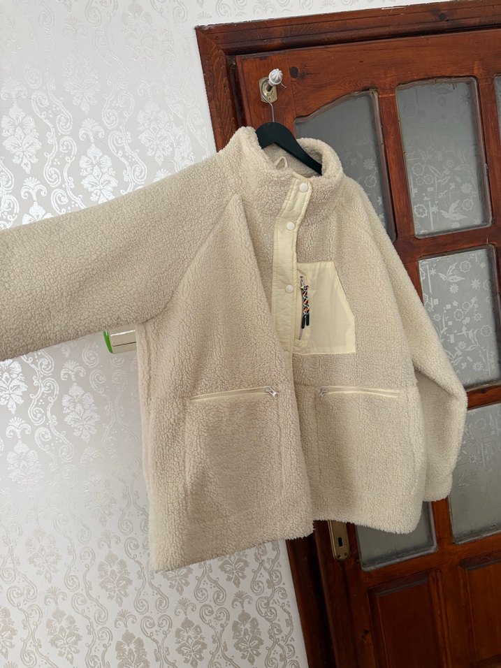 Bej renkte, uzun kollu peluş kumaştan yapılmış, kürk detaylı kısa kesim mont. Salaş kesimi ve bisiklet yaka tasarımıyla rahat bir görünüm sunar. Yeni durumda