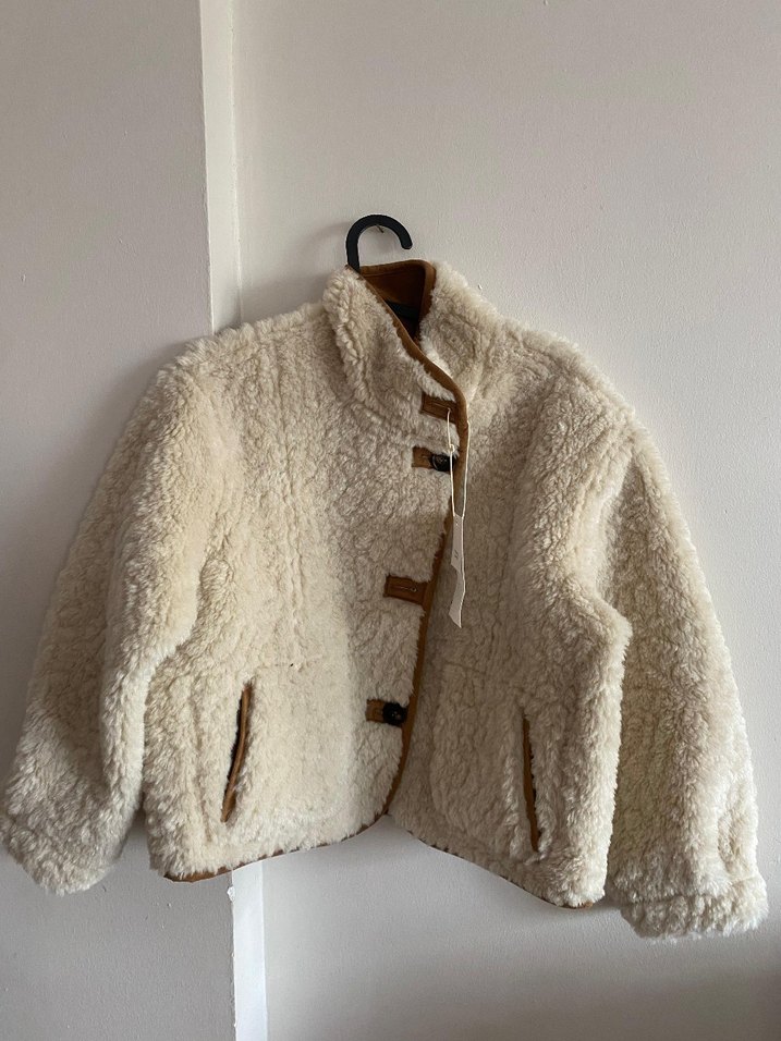 Bej renkli peluş kumaştan yapılmış, gevşek kesimli, yakalı ve kürk detaylı kadın midi ceket. Rahat ve gündelik kullanım için uygundur iki taraflı kullanılabiliyor.