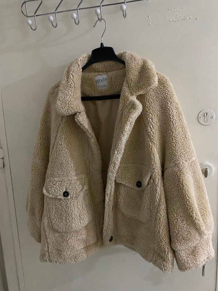 Bej renkte, peluş kumaştan yapılmış, notalı yaka ve uzun kollu kadın midi ceket. Rahat kesimi ve düğmeli iki ön cepli tasarımı ile günlük kullanım için idealdir.