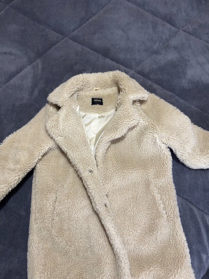 Bej renkli, uzun kollu, normal boy midi kaban. Yumuşak ve sıcak peluş kumaştan, kürk detaylı. Rahat ve salaş kesim, gündelik sokak stili için uygundur.