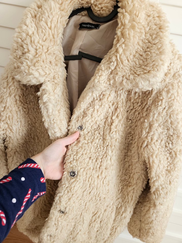 Bej renk, peluş detaylı, notched lapel yaka ve uzun kollu kadın midi kaban. Salaş kesim ve rahat sokak stili için uygun.