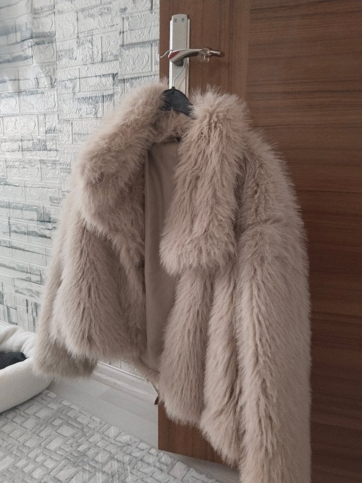 Bej renkli, peluş kumaştan yapılmış, bol kesim ve uzun kollu, yakası kesik detaylı midi uzunlukta günlük kullanıma uygun kadın kürk ceketi.