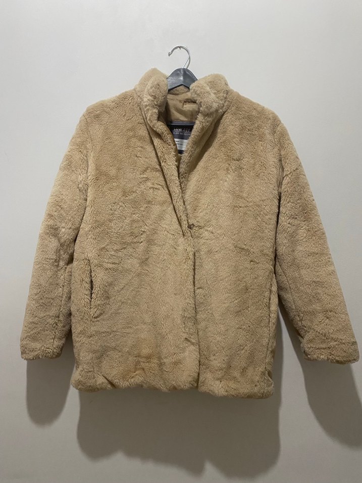 Bej renkli, yumuşak ve sıcak peluş kumaştan yapılmış kadın mont. Notlu yaka ve uzun kolludur, bol ve midi boydadır. Günlük sokak stiline uygundur.