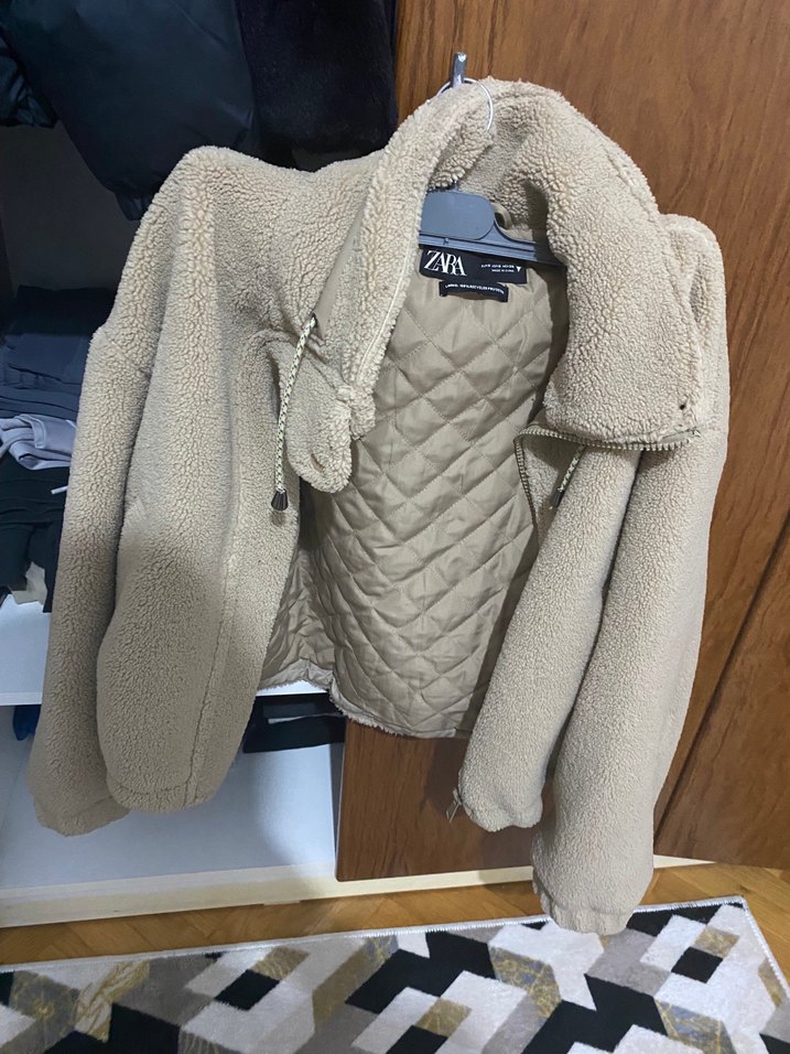 Bej peluş kumaştan yapılmış, salaş kesim ve kruvaze yakalı kadın mont. Yumuşak kürk detaylı ve kapitone astarlı, günlük kullanıma uygun rahat bir parça.