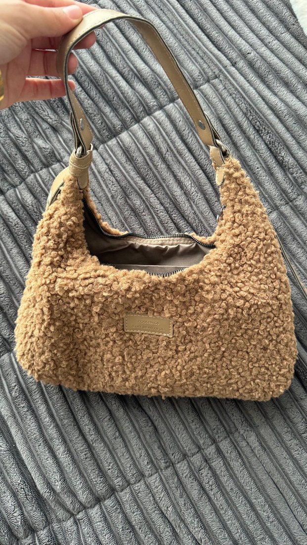 Bej renkte, peluş detaylı kadın omuz çantasıdır. Yumuşak dokusu ve fermuarlı ana bölmesi ile kullanışlıdır.