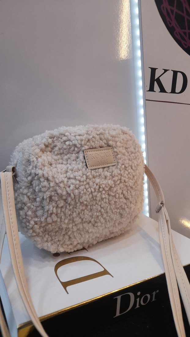 Yumuşak, peluş kumaştan yapılmış bej omuz çantası, kürk detaylıdır. Ayarlanabilir askısı ve sade deseni vardır. Üzerinde KD işareti bulunur.