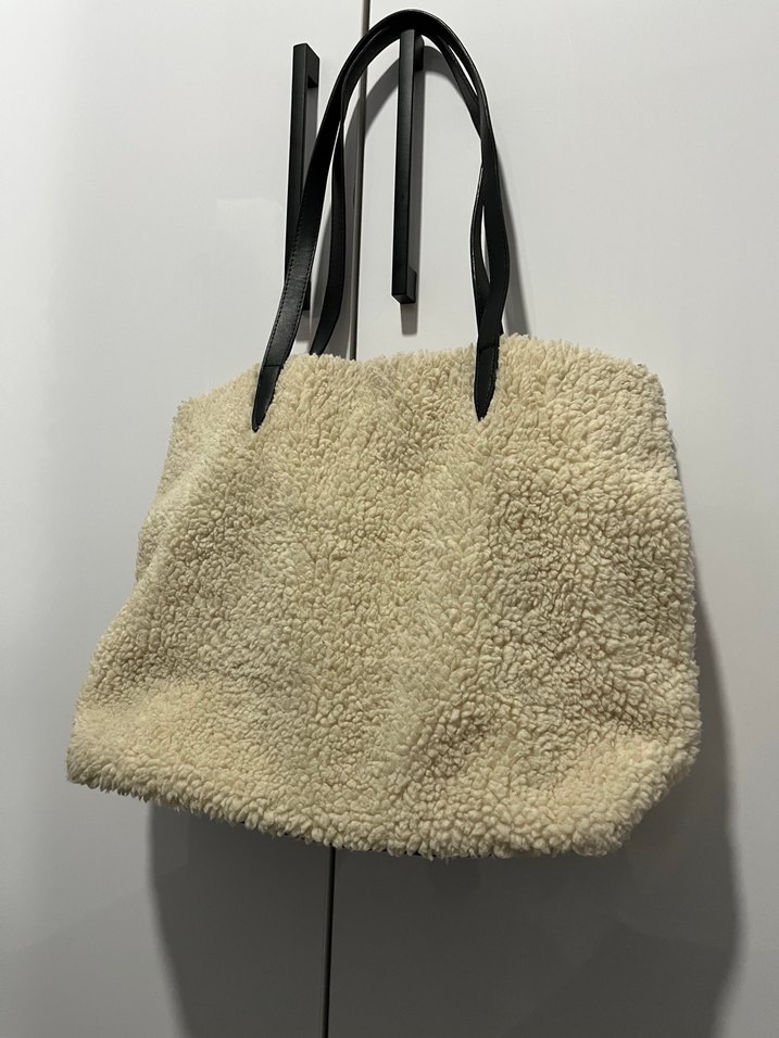 Bej renkte, peluş detaylı ve siyah saplı kadın omuz çantası çok az kullanıldı