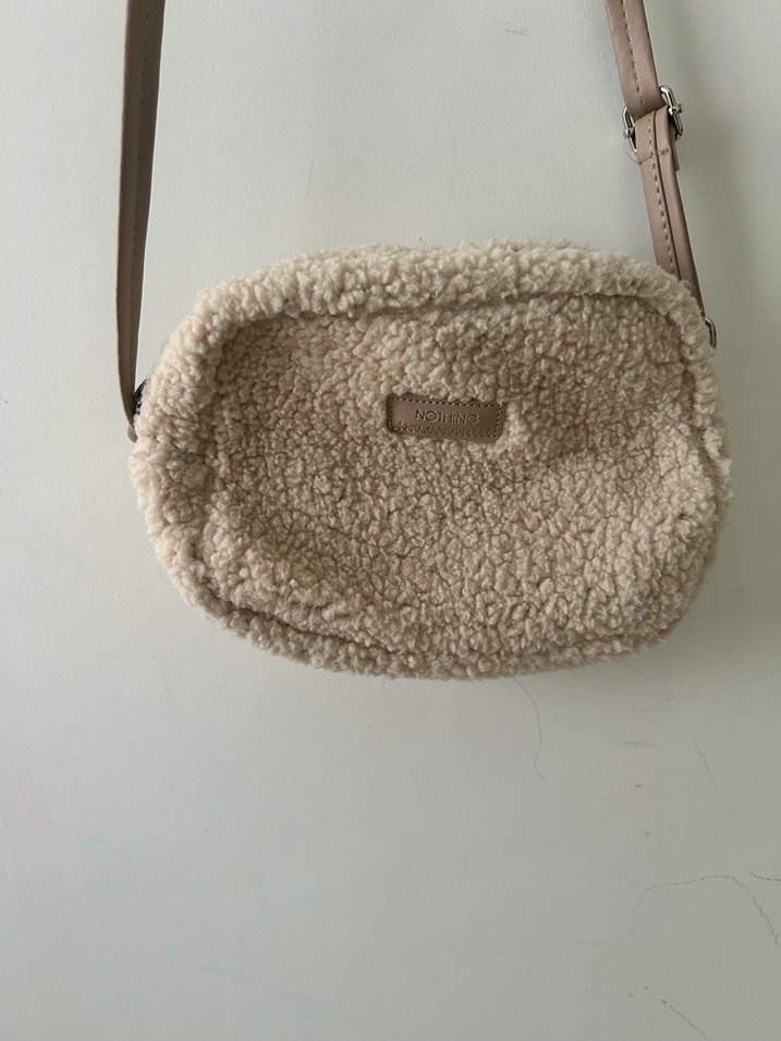 Bej renkli kadın omuz çantası, yumuşak ve sıcak peluş dokusuyla tüy detaylara sahip. Günlük kullanıma uygun sade ve rahat bir tasarım sunar.