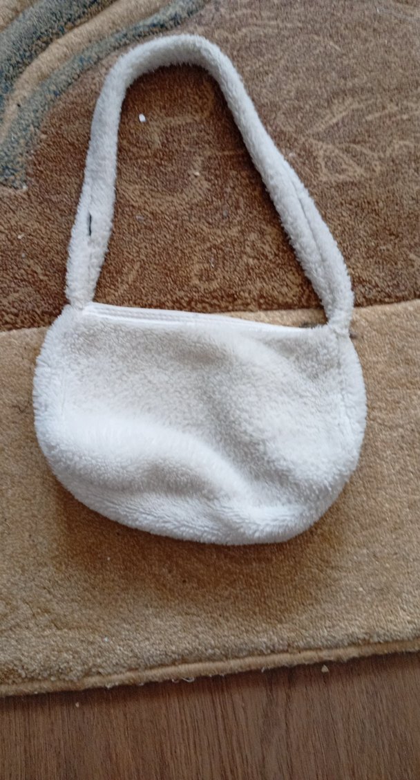 Bej renkte, yumuşak ve sıcak kumaştan yapılmış, kürk detaylı günlük kullanıma uygun sade sokak stilinde omuz çantası.