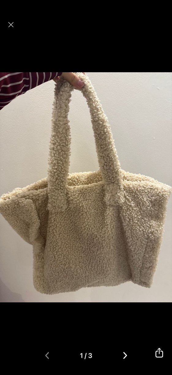 Bej renkli, yumuşak ve sıcak dokulu kumaştan yapılmış, kürk detaylı, sade ve rahat tasarımlı kadın omuz çantası.