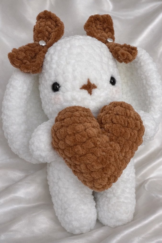 Yumuşak bej peluş tavşan, kahverengi dokulu kalp tutuyor. Kulaklarında fiyonk detaylı, sevimli ve rahatlatıcı oyuncak.