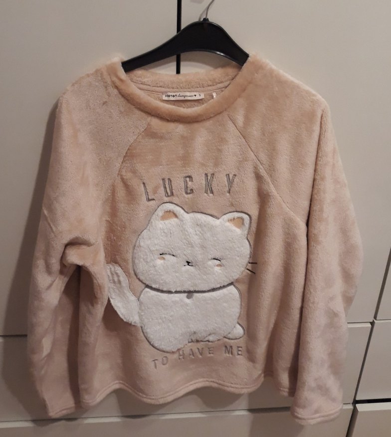 Yumuşak peluş kumaştan bej renkli, baskılı sevimli kedi deseni ve 'LUCKY' yazılı street wear sweatshirt. YENI giyilmedi