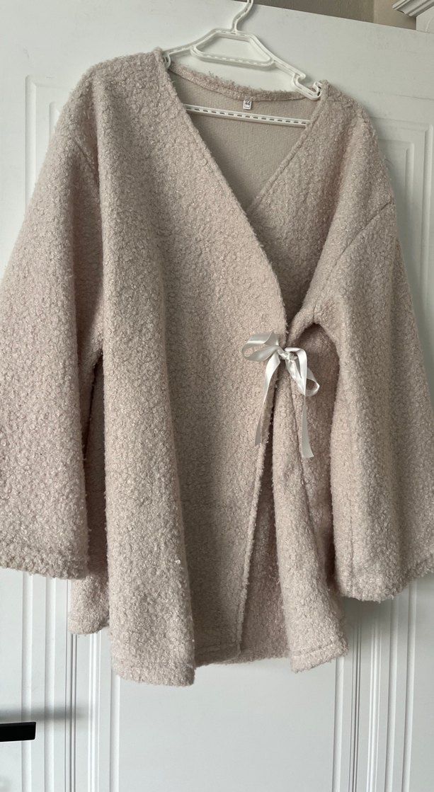 Bej renkte, peluş kumaştan yapılmış, Geniş kesim, uzun kollu ve yakalıdır. Midi boyda, kurdeleyle bağlanır. Günlük kullanıma uygundu