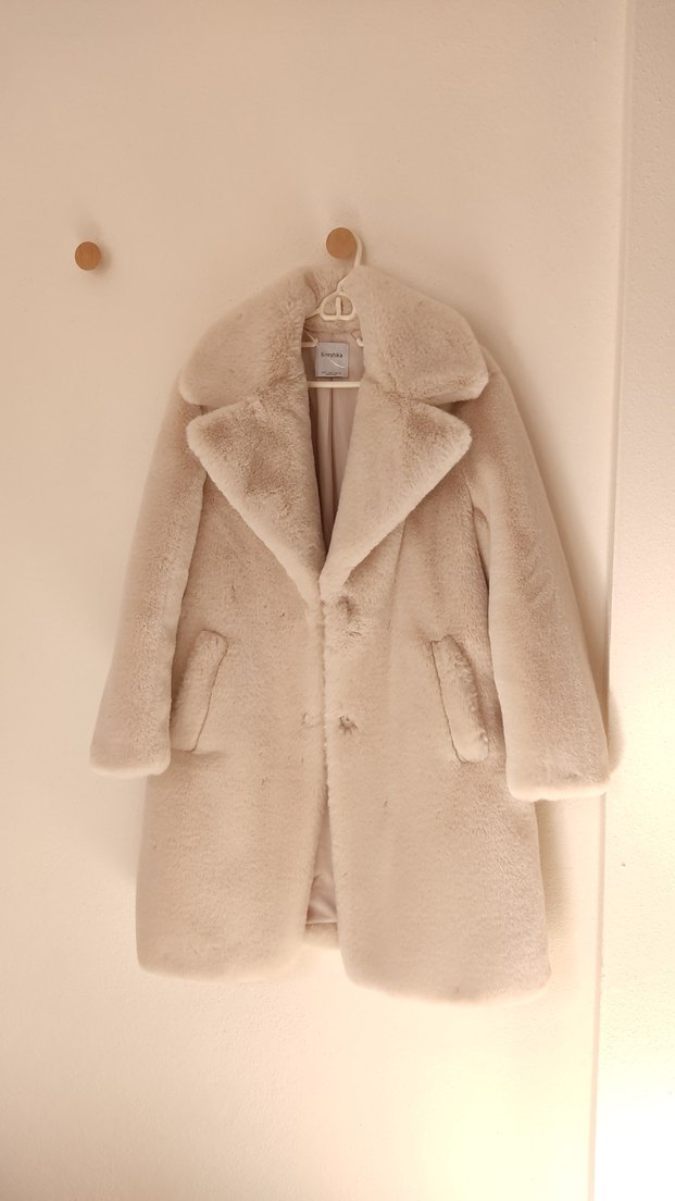 Oversize peluş kürk. Açık bej rengi. Oldukça pofuduk ve yumuşak dokulu. Sayılı kullanıldı. Leke vb hiç bi sorunu yok. Minyon olduğum için içinde kayboluyorum. Son fiyattır.
