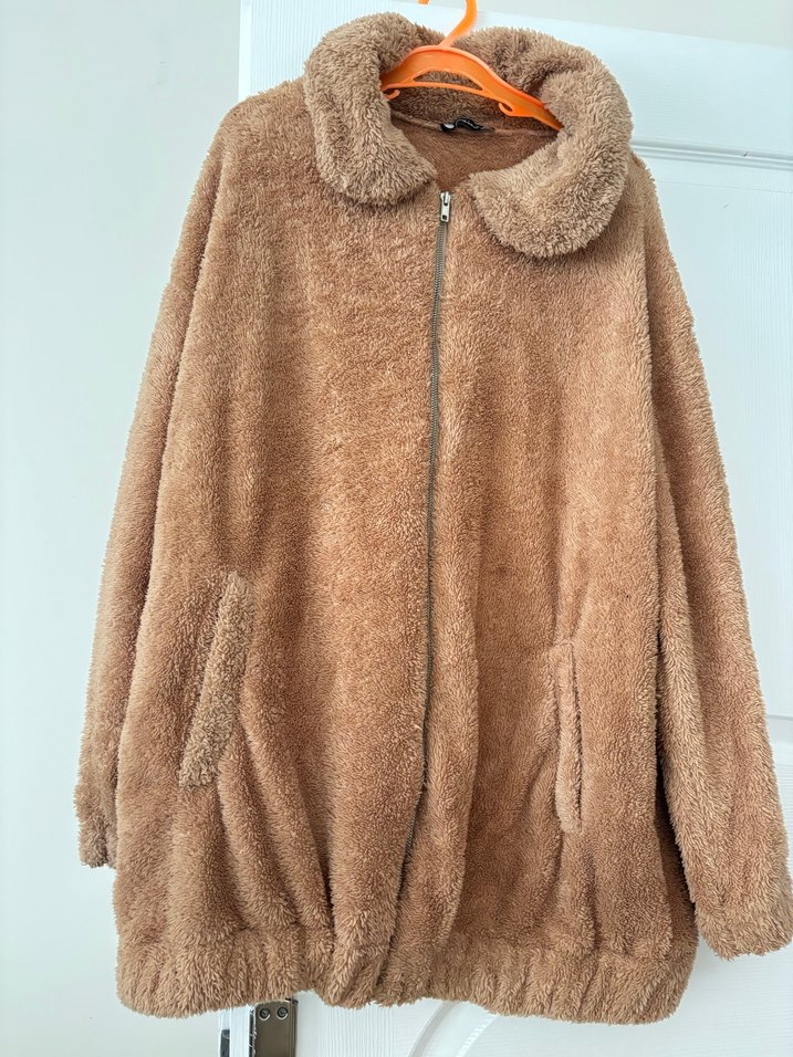 Bej renkte, yumuşak ve sıcak dokulu midi uzunlukta, peluş detaylı yakalı, uzun kollu, bol kesim kadın ceket. Ön cepleri ve fermuarı bulunur.