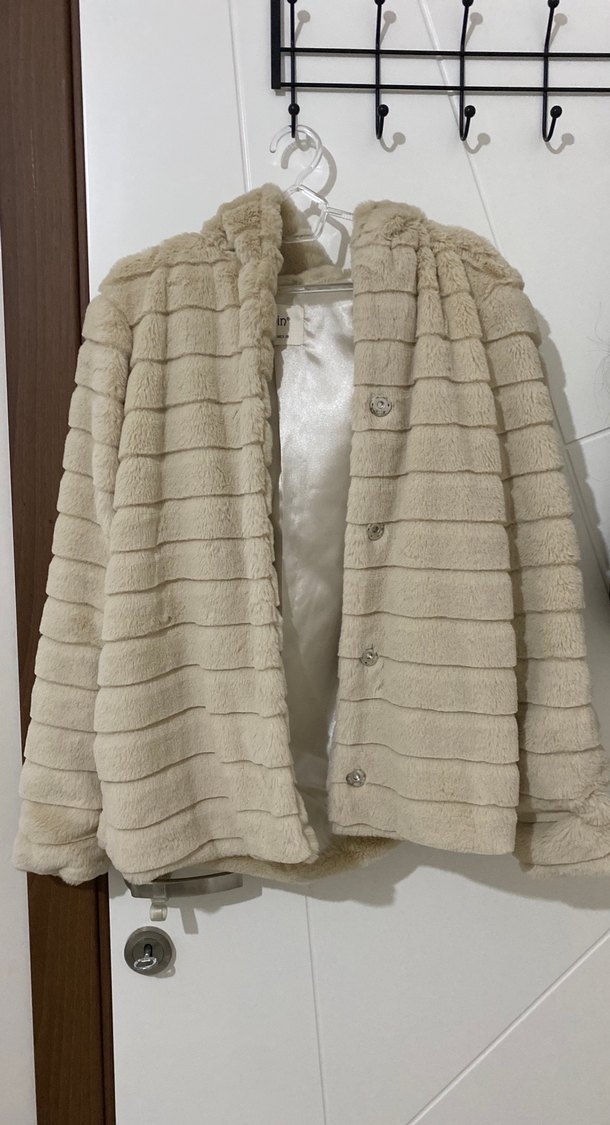 Bej renkli, normal boy midi peluş kürk.Yakası kesik ve uzun kolludur. Rahat kesimi ve yumuşak dokusuyla günlük kullanıma uygundur.