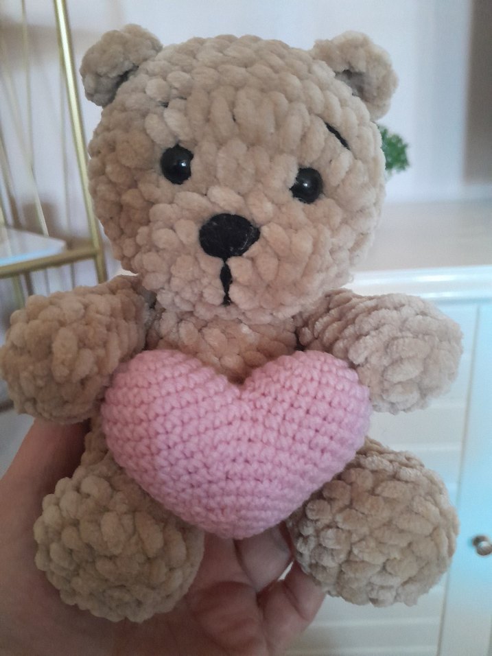 Bej renkli peluş ayıcık, yumuşak pembe kalp tutuyor. Dokulu ve rahat bir kumaştan yapılmıştır. Siyah düğme gözleri ve nakışlı burun ve ağzı vardır.