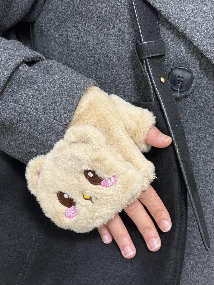 Yumuşak dokulu, sevimli yüz detaylı bej peluş oyuncak eldiven, sıcaklık ve şıklık sağlar.