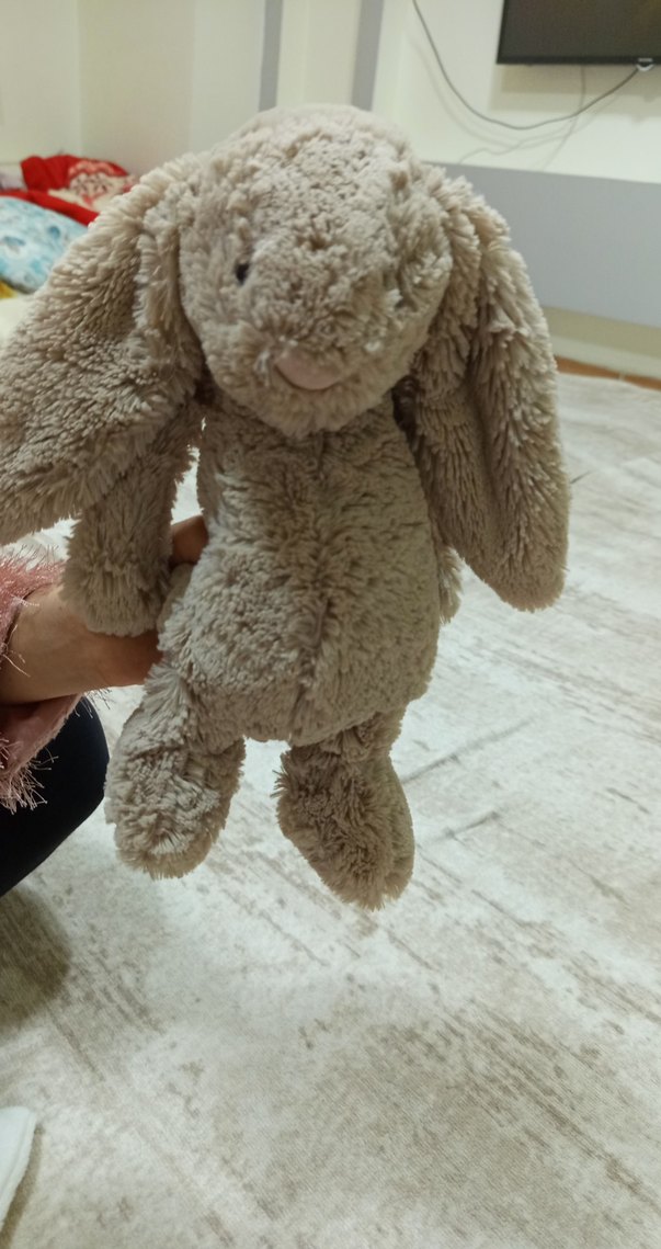 Uzun kulaklı, yumuşak ve peluş bej tavşan oyuncak. Rahatlatıcı ve oyun için uygundur.