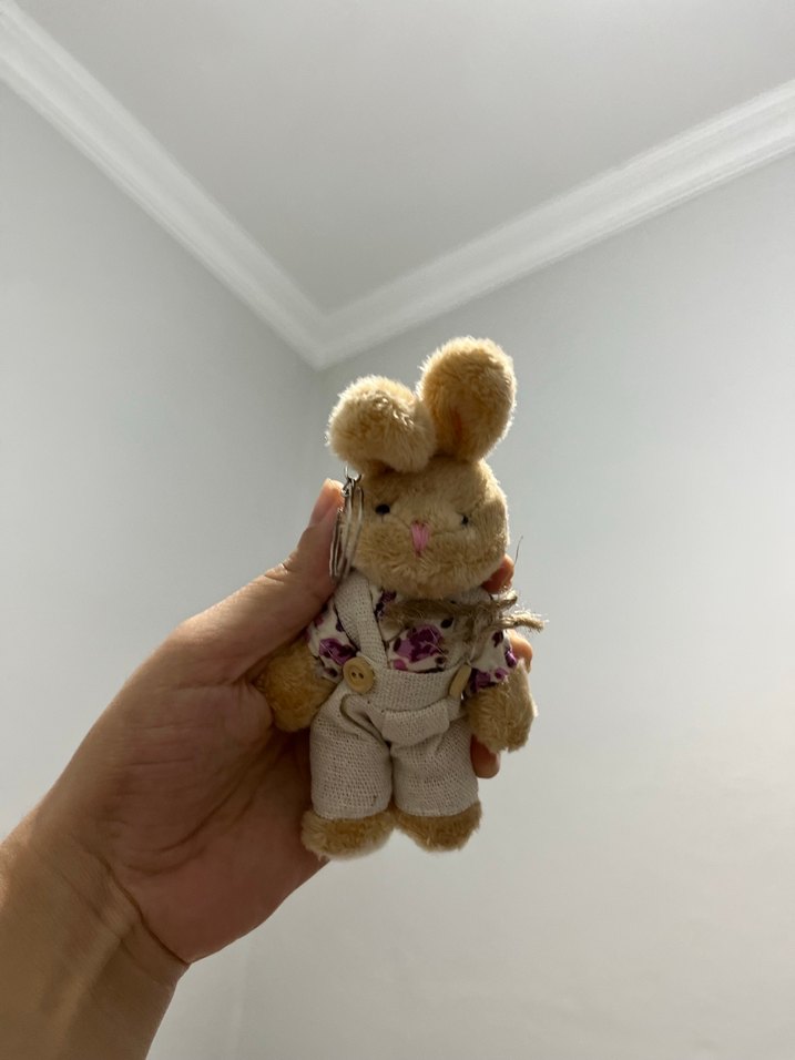 Bej renkli peluş tavşan, yumuşak kumaştan, pastel tonlarda, çiçek desenli gömlek ve açık renk tulum anahtarlık