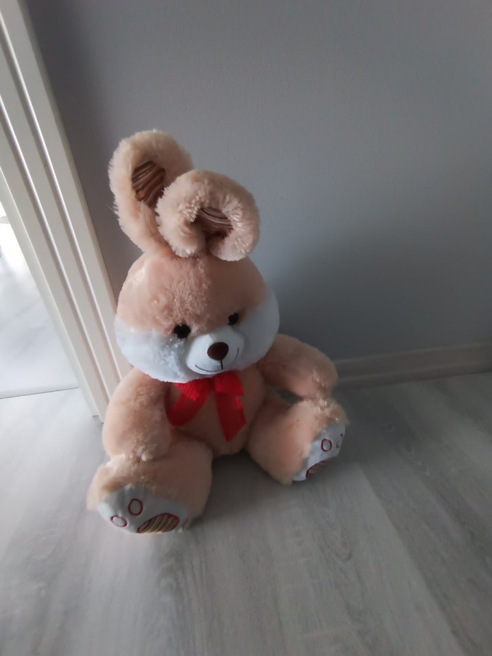 Yumuşak dokulu bej peluş tavşan, pastel tonlarda ve kırmızı fiyonk detaylı. Pati kısmında işleme desenleri bulunur. yeniden hiç farkı yok kulnalinmadi desem olur mis gibi