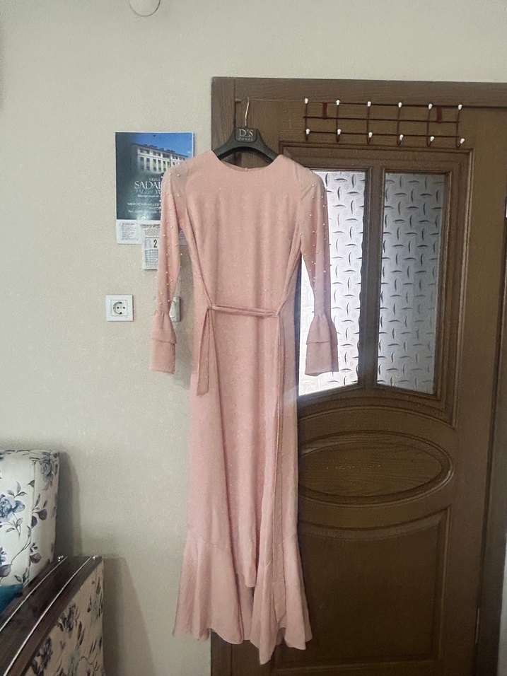 Bej renkte, uzun kollu ve yüksek yakalı, yumuşak sentetik kumaştan yapılmış, drapeli ve belden bağlamalı uzun elbise. Günlük ve sade kullanıma uygundur.
