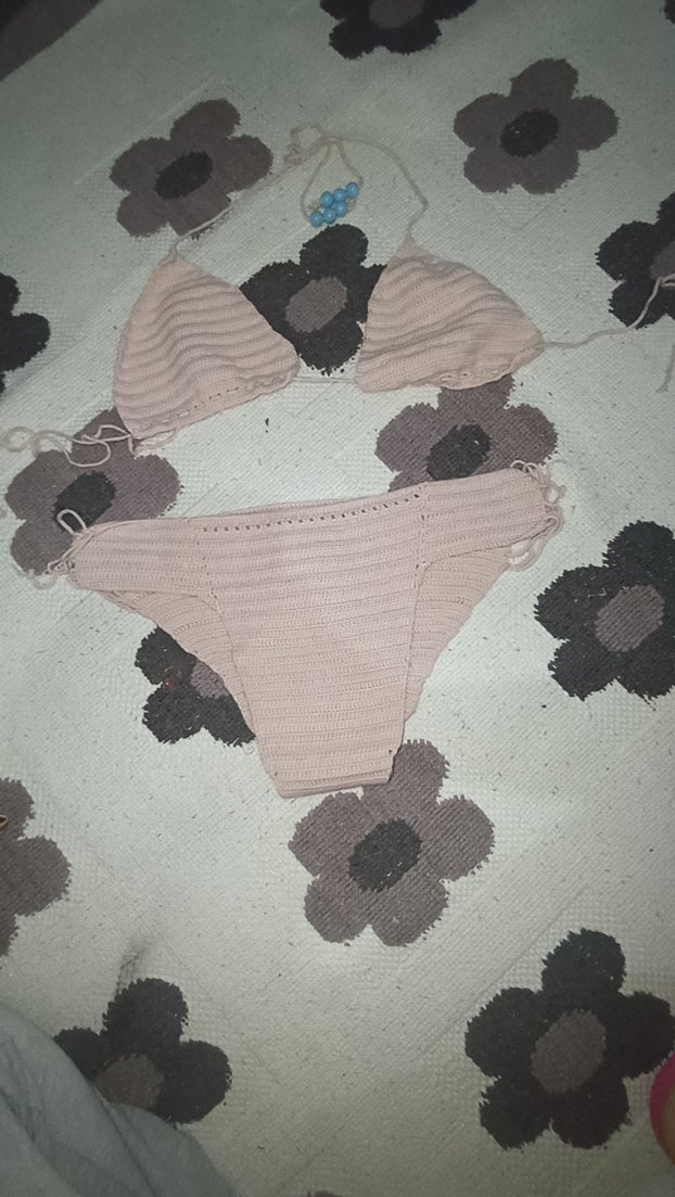 Bej renkli, örgü kumaştan yapılmış, ince askılı ve mini boyda, bohem tarzda rahat ve şık bikini takımı.
