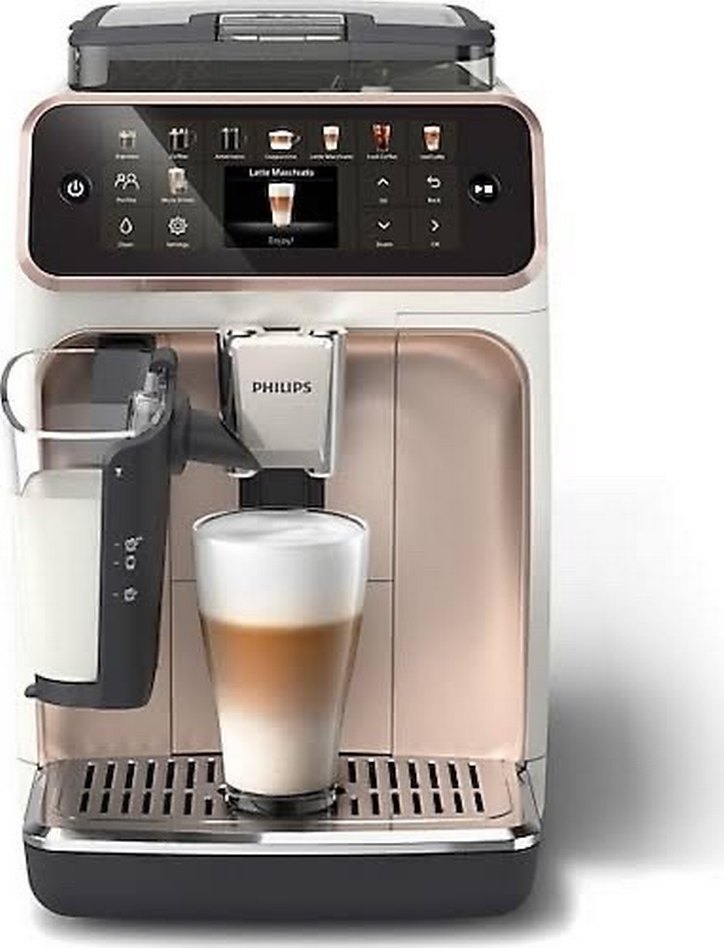Bej renkli Philips kahve makinesi, dijital ekran ve entegre süt köpürtücü ile çeşitli kahve türleri hazırlamak için uygundur. ☕