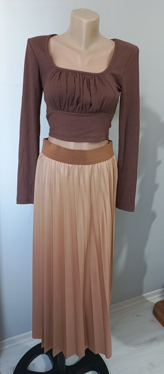 Bej renkli, pileli ve bol kesim uzun etek, yumuşak sentetik kumaştan yapılmıştır. Minimalist tarzıyla günlük kullanıma uygundur.