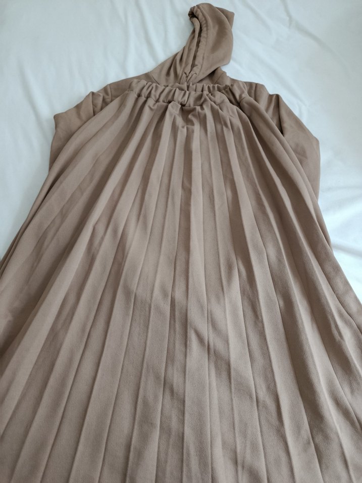 Bej renkli, keten kumaştan yapılmış, pileli ve bol kesim uzun etek. Minimalist bohem tarzıyla günlük kullanıma uygundur.