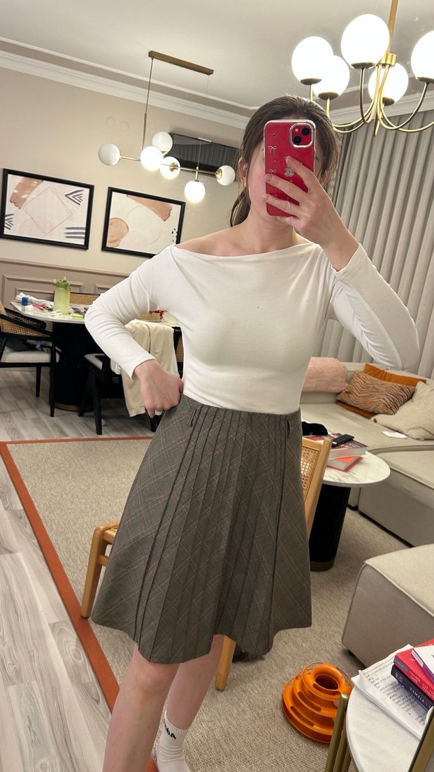 Bej renkli, kumaştan yapılmış, pileli ve bol kesim midi etek. Paris tarzı ve günlük kullanıma uygun.