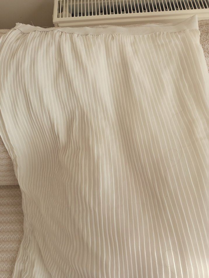 Bej renkli, pileli ve bol kesim midi etek, yumuşak sentetik kumaştan üretilmiştir. Bohem tarzıyla ofis kombinlerine uygundur.