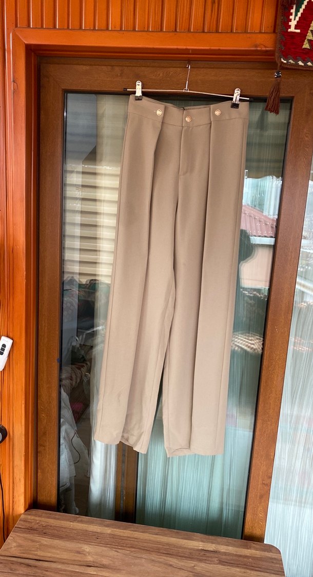 Bej renkli, pileli midi boy kumaş pantolon, normal kesim ve desensiz tasarıma sahip, ofis kullanımı için uygundur. ✨urun utu izleri var fiyata yasıtmıstır