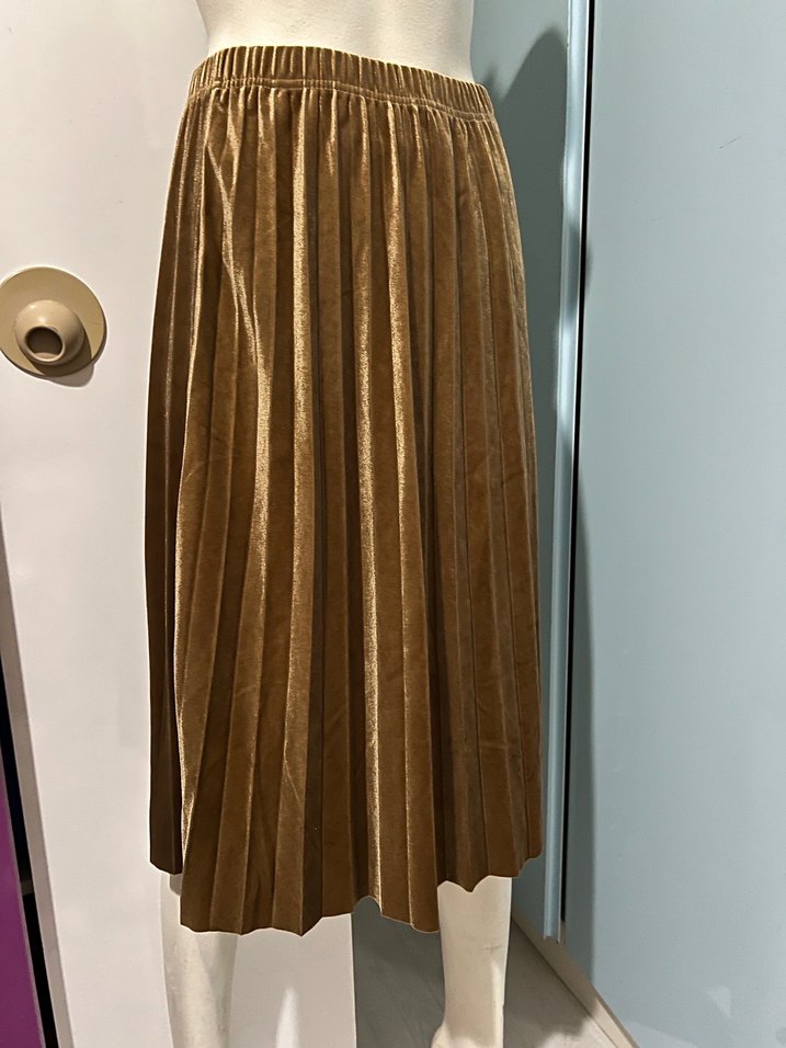 Bej renkli, parlak süet dokulu, pileli uzun etek. Rahat kesimiyle çağdaş ve retro tarzları yansıtır, ofis için uygundur. Marka temsilidir.