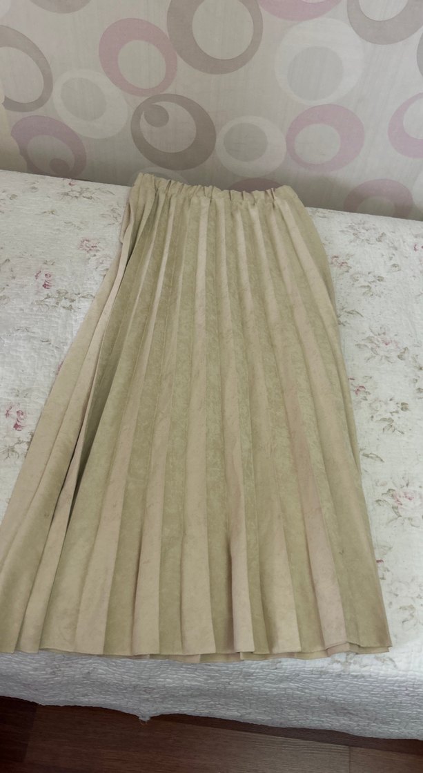 Bej renkli, pileli ve bol kesim uzun etek. Yumuşak sentetik kumaştan yapılmıştır. Bohem tarzıyla vintage ve hippie görünüme uygundur, düğünler için ideal.