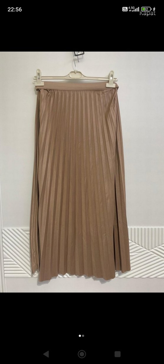 Bej renkte, deri görünümlü pileli ve uzun kesim kadın eteği. Düz, desen içermeyen tasarımı ve rahat kesimiyle günlük kullanıma uygundur. s, m bedene uygun