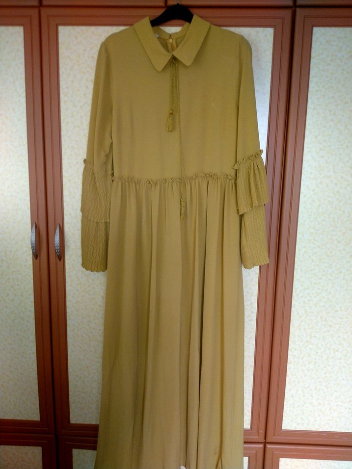 Bej renkli, keten kumaştan yapılmış, pile detaylı uzun ve bol kesim elbise. Uzun kollu ve yuvarlak yaka tasarıma sahiptir, vintage bohem tarzını yansıtır.