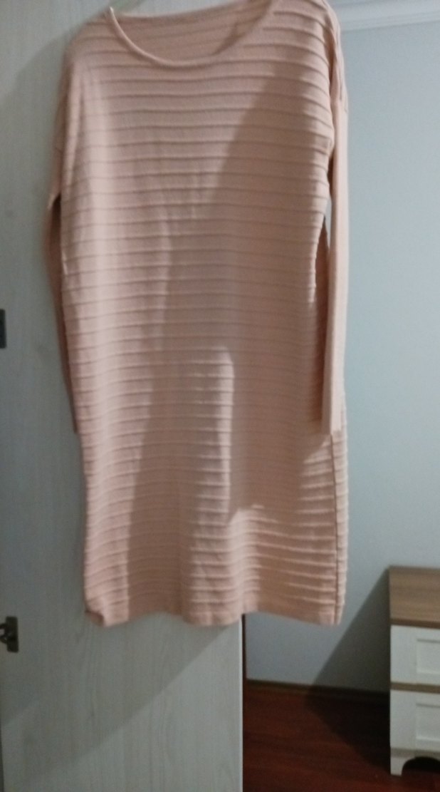 Bej renkte, pilili ve boğazlı uzun kollu, midi boy kadın kazak. Sentetik yumuşak kumaştan, rahat ve şık günlük kullanım için uygundur.