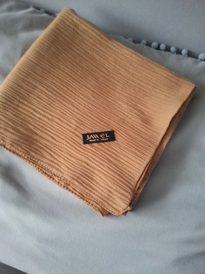 Hardal renkte, pilili dokusu ve parlak yüzeyi olan, yumuşak sentetik kumaştan yapılmış, rahat ve bohem tarzda kadın eşarbı. JAWEL etiketi bulunmaktadır.
